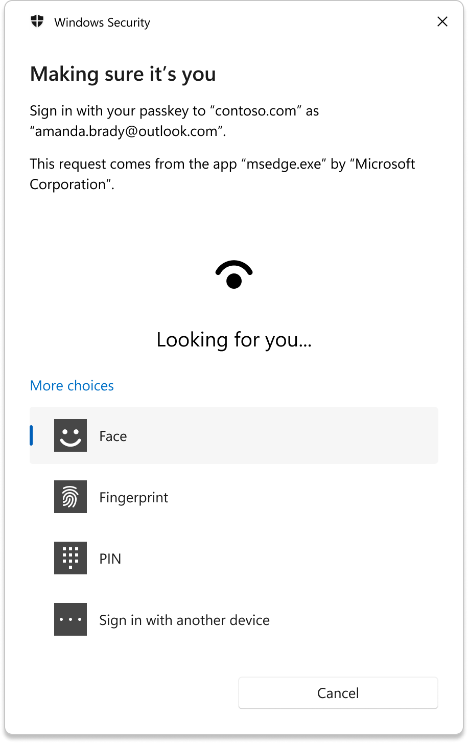 When you open a website or app that supports passkeys, if a passkey is stored locally, you're automatically prompted to use Windows Hello to sign in. You can also choose to use a passkey from one of the following locations:
