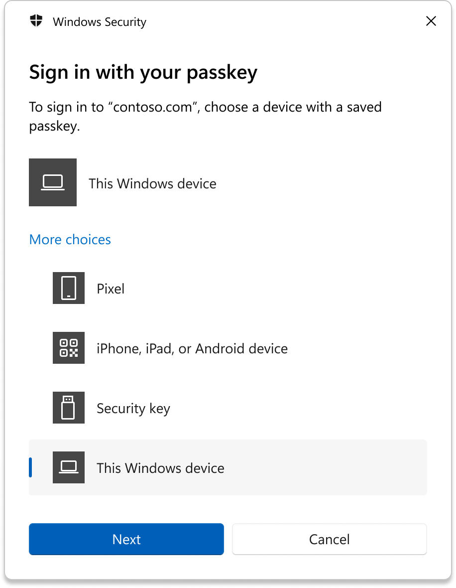 By default, Windows offers to save the passkey locally on the Windows device, in which case the passkey is protected by Windows Hello (biometrics and PIN). You can also choose to save the passkey in one of the following locations: