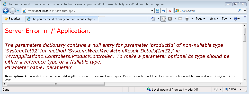 Dado que la acción Details() espera un parámetro entero, la realización de una solicitud que contenga algo distinto de un valor entero provocará un error. Por ejemplo, si escribe la dirección URL /Product/apple en el explorador, obtendrá la página de error de la figura 1.