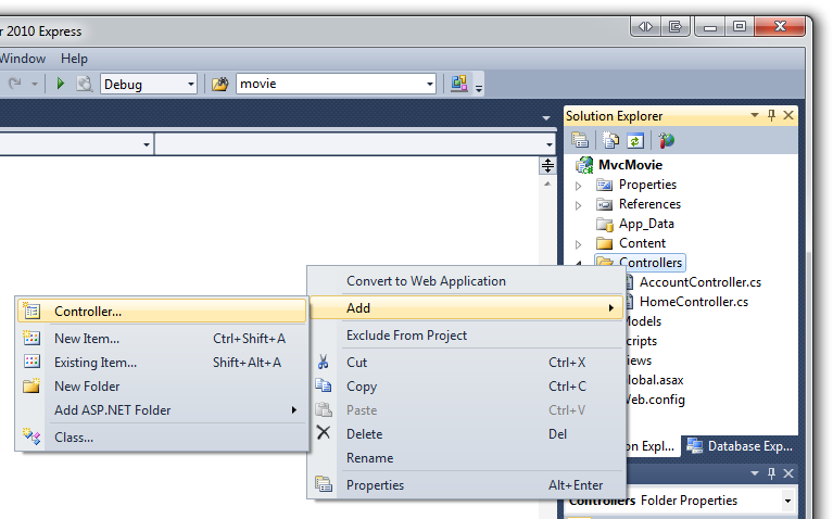 Comencemos creando una clase de controlador. En el Explorador de soluciones, haga clic con el botón derecho en la carpeta Controllers y, después, seleccione Agregar controlador.