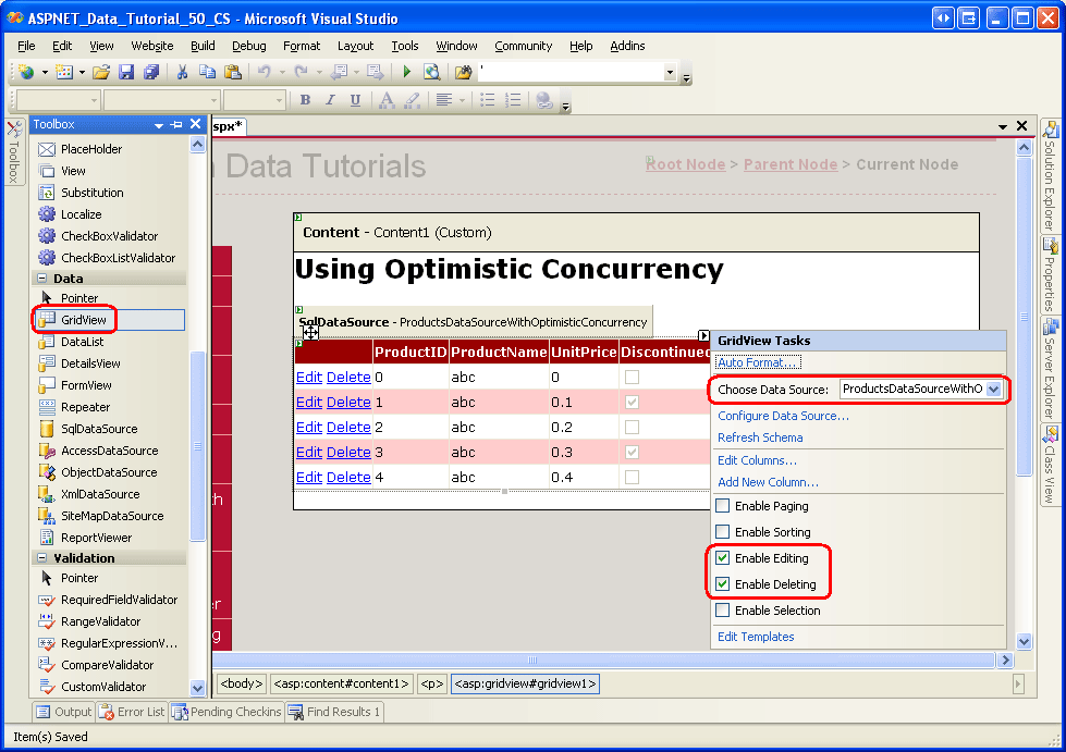 Como veremos en este tutorial, habilitar el control de simultaneidad optimista con SqlDataSource es tan sencillo como marcar una casilla.