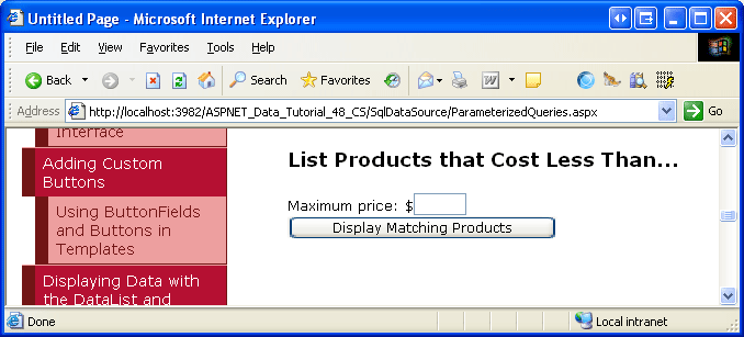 Escriba un valor en el cuadro de texto, como 5.00, y haga clic en el botón Mostrar productos coincidentes. En postback, SqlDataSource informa a GridView de que uno de sus orígenes de parámetros ha cambiado. Por lo tanto, GridView se vuelve a enlazar con SqlDataSource, mostrando esos productos con un precio de $5,00 o menos.