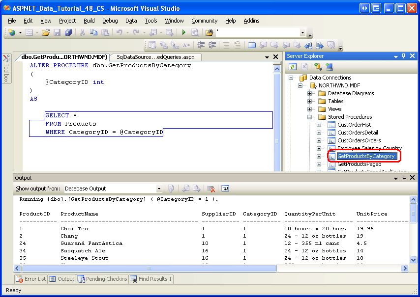 Para ilustrar el uso de procedimientos almacenados en SqlDataSource, vamos a crear un nuevo procedimiento almacenado en la base de datos Northwind denominada GetProductsByCategory, que acepta un parámetro denominado @CategoryID y devuelve todas las columnas de los productos cuya CategoryID columna coincide @CategoryIDcon . Para crear un procedimiento almacenado, vaya al Explorador de servidores y explore en profundidad la NORTHWND.MDF base de datos. (Si no ve el Explorador de servidores, ábralo yendo al menú "Ver" y seleccionando la opción Explorador de servidores).