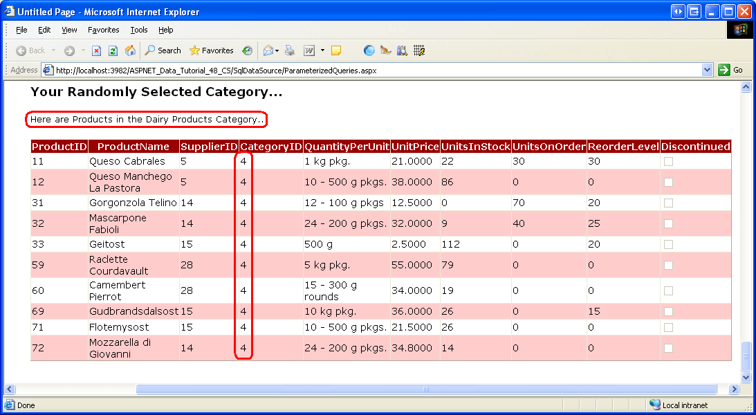 Para ilustrar cómo trabajar con los datos de SqlDataSource mediante programación, imagine que su jefe se ha acercado a usted con una solicitud para crear una página web que muestre el nombre de una categoría seleccionada aleatoriamente y sus productos asociados. Es decir, cuando un usuario visita esta página, queremos elegir aleatoriamente una categoría de la Categories tabla, mostrar el nombre de categoría y, a continuación, enumerar los productos que pertenecen a esa categoría.