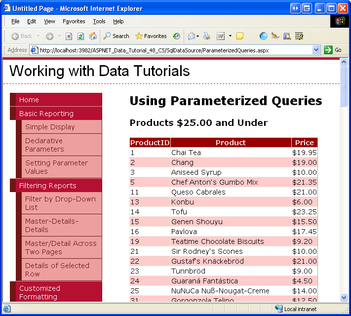 Cuando se invoca el método Select() de SqlDataSource, el valor del parámetro UnitPrice (25.00) se aplica al parámetro @UnitPrice en SelectCommand antes de enviarse a la base de datos. El resultado neto es que solo se devuelven de la Products tabla los productos menores o iguales a 25,00 USD. Para confirmarlo, agregue una clase GridView a la página, vincule a este origen de datos y, a continuación, vea la página a través de un explorador. Solo debería ver los productos enumerados que son menores o iguales a 25,00 USD, como confirma la figura 3.