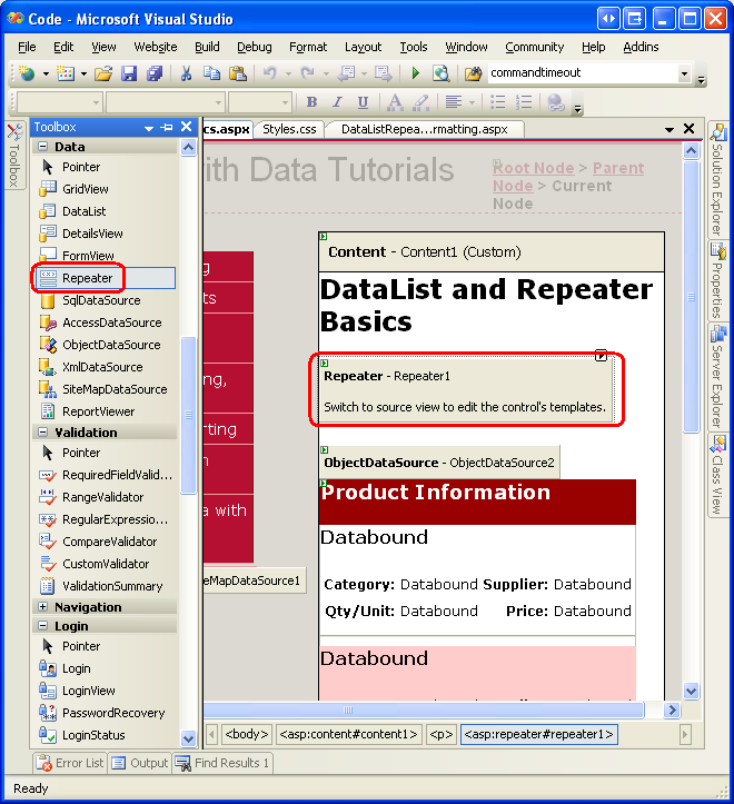 El control Repeater actúa como un control web de captura de todos los datos. Si no hay un control existente que genere el marcado necesario, se puede usar el control Repeater. Para ilustrar el uso del control Repeater, la lista de categorías se mostrará encima del control DataList Product Information creado en el paso 2. En concreto, las categorías se mostrarán en un elemento <table> HTML de una sola fila, cada categoría como una columna de la tabla.