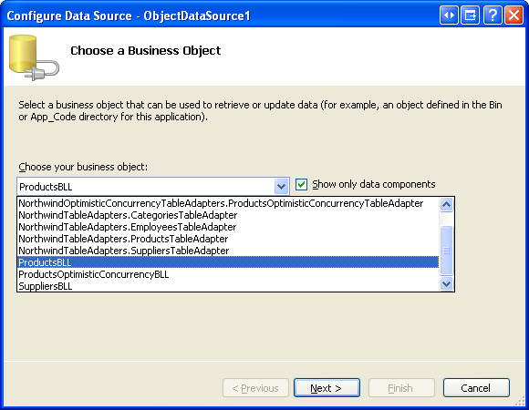 Figura 14: Creación de un elemento ObjectDataSource (Haga clic para ver la imagen a tamaño completo)