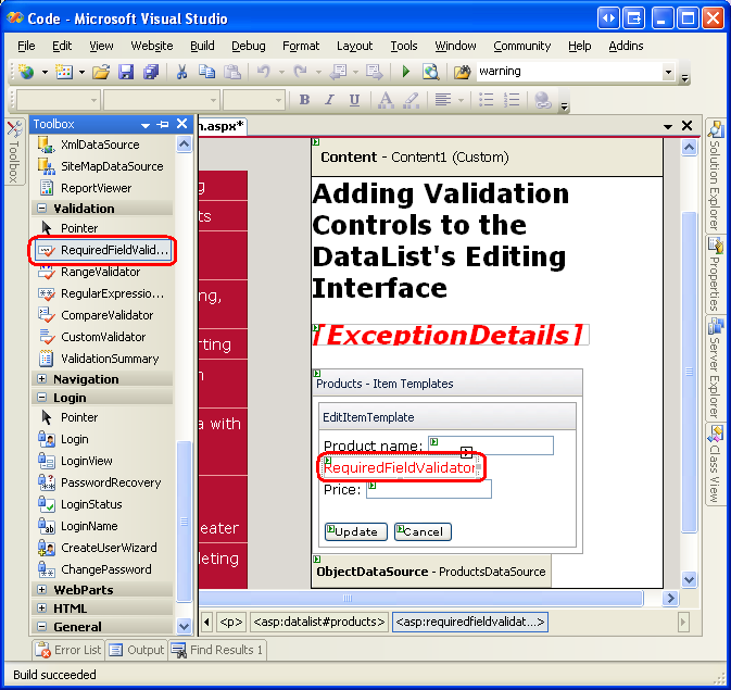 En los tutoriales de edición de DataList hasta el momento, las interfaces de edición de DataLists no incluían ninguna validación proactiva de entrada de usuario, aunque una entrada de usuario no válida (como un nombre de producto que falta o un precio negativo) diera como resultado una excepción. En el tutorial anterior vimos cómo agregar código de control de excepciones al controlador de eventos UpdateCommand de DataList para detectar y mostrar correctamente información sobre las excepciones generadas. Lo ideal, sin embargo, es que la interfaz de edición incluya controles de validación para impedir desde el principio que un usuario escriba estos datos no válidos.