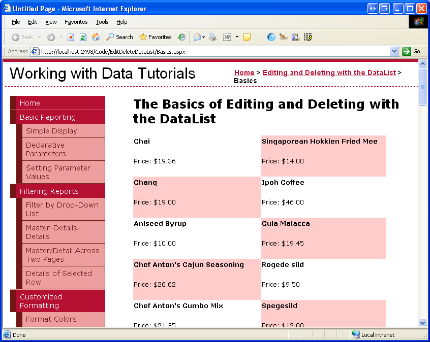 Después de actualizar Web.sitemap, dedique un momento a ver el sitio web de tutoriales a través de un explorador. El menú de la izquierda ahora incluye elementos para la edición, inserción y eliminación de tutoriales de la DataList.