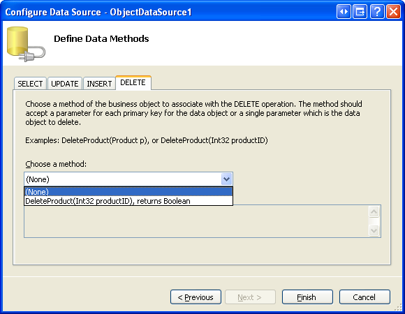 Figura 6: Confirmar que las listas desplegables en las pestañas INSERT, UPDATE y DELETE de ObjectDataSource están establecidas en (Ninguno) (Haga clic para ver la imagende tamaño completo)