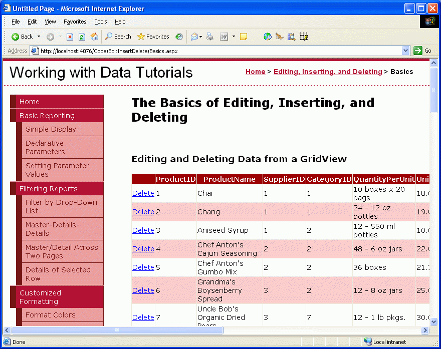 Después de actualizar Web.sitemap, dedique un momento a ver el sitio web de los tutoriales desde un explorador. Ahora el menú de la izquierda incluye elementos para los tutoriales sobre edición, inserción y eliminación.