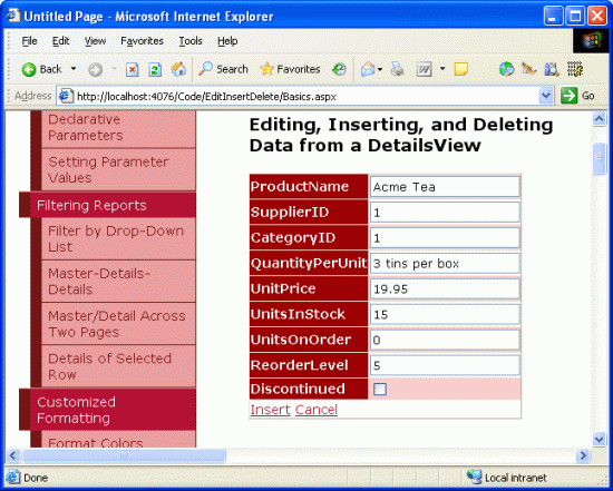 En la figura 24 se muestra FormView en un explorador al agregar un nuevo producto, Acme Coffee. Observe que los campos SupplierName y CategoryName que aparecen en ItemTemplate ya no están presentes, pues se acaban de eliminar. Cuando se hace clic en el botón Insertar, FormView continúa con la misma secuencia de pasos que el control DetailsView, y agrega un nuevo registro a la tabla Products. En la figura 25 se muestran los detalles del producto Acme Coffee en FormView después de insertarlo.