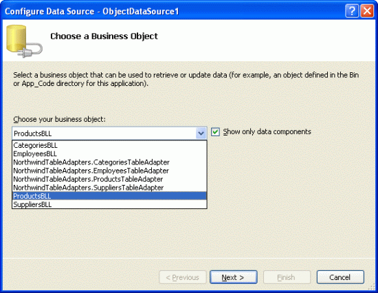 Figura 5: Configuración de ObjectDataSource para usar la clase ProductsBLL (Haga clic para ver la imagen a tamaño completo)