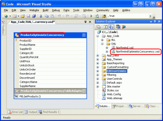 En lugar de ampliar los TableAdapters de la DAL existente para usar la simultaneidad optimista (lo que requeriría cambiar el BLL para dar cabida), vamos a crear un nuevo Conjunto de datos con tipo denominado NorthwindOptimisticConcurrency, al que agregaremos un Products TableAdapter que use la simultaneidad optimista. Después, crearemos una ProductsOptimisticConcurrencyBLL clase de capa lógica de negocios que tenga las modificaciones adecuadas para admitir la dal de simultaneidad optimista. Una vez que se haya establecido esta base, estaremos listos para crear la página de ASP.NET.