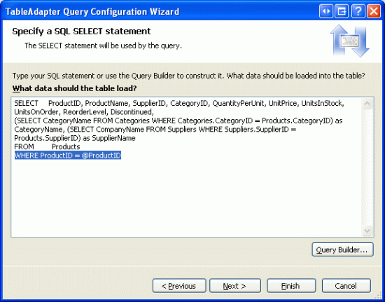 En la siguiente pantalla se le pedirá que use la consulta SQL, con la consulta predeterminada de TableAdapter precargada. Aumente la consulta existente para incluir la cláusula WHERE ProductID = @ProductID, como se muestra en la figura 10.