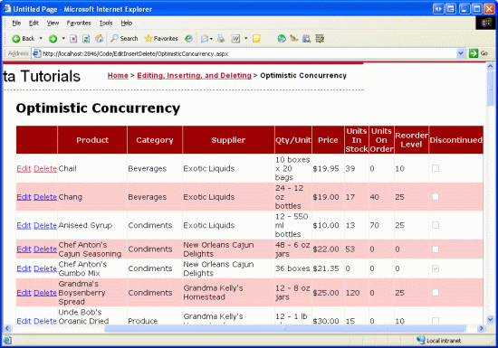 Desde la perspectiva del usuario final, al hacer clic en el botón Eliminar de Chai Tea en la segunda ventana del navegador, la pantalla parpadeó y, al volver, el producto todavía está allí, aunque ahora aparece como "Chai" (el cambio de nombre del producto realizado por la primera instancia del explorador). Si el usuario hace clic de nuevo en el botón Eliminar, eliminar se realizará correctamente, ya que el valor original ProductName de GridView ("Chai") ahora coincide con el valor de la base de datos.