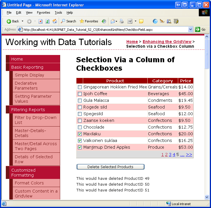 La Rows propiedad devuelve una colección de instancias que forman las filas de datos del GridViewRow GridView. El foreach bucle aquí enumera esta colección. Para cada objeto GridViewRow, se accede programáticamente al CheckBox de la fila utilizando row.FindControl("controlID"). Si el CheckBox está marcado, se recupera el valor de la fila correspondiente de la colección ProductID. En este ejercicio, simplemente mostramos un mensaje informativo en la etiqueta DeleteResults, aunque en una aplicación en funcionamiento, haríamos una llamada al método de la clase ProductsBLLDeleteProduct(productID).