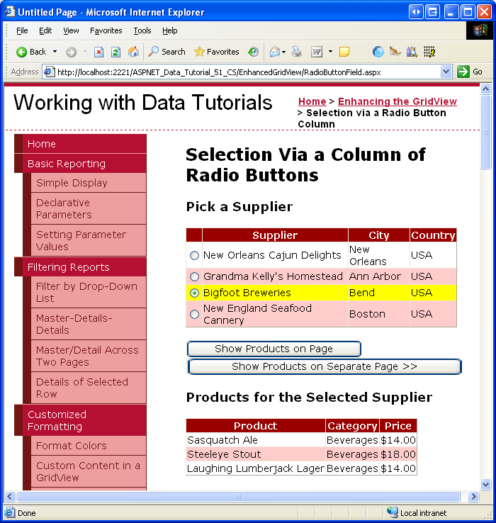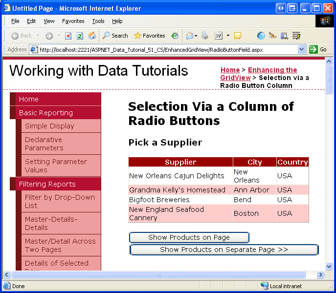 Una vez que el usuario haya seleccionado una fila GridView, es necesario mostrar los productos del proveedor seleccionado. En algunas circunstancias, es posible que deseemos mostrar estos productos en una página independiente, en otras es posible que prefieramos hacerlo en la misma página. Examinemos primero cómo mostrar los productos en una página independiente; en el paso 5 veremos cómo agregar gridView para RadioButtonField.aspx mostrar los productos del proveedor seleccionado.