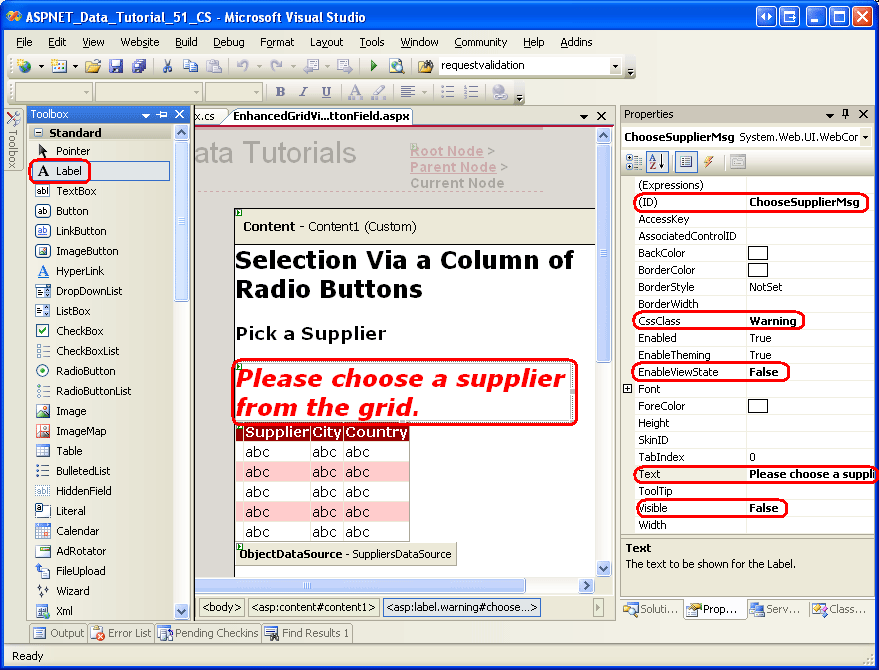 Para dar cabida a un SuppliersSelectedIndex valor de -1, agregue un control Web Label a la página situada encima de GridView. Establezca su propiedad ID a ChooseSupplierMsg, su propiedad CssClass a Warning, sus propiedades EnableViewState y Visible a false, y su propiedad Text a "Elija un proveedor de la cuadrícula". La clase Warning CSS muestra texto en rojo, cursiva, negrita, fuente grande y se define en Styles.css. Al establecer las propiedades EnableViewState y Visible en false, la etiqueta no se representa excepto durante aquellos postbacks en los que la propiedad Visible del control se establece mediante programación en true.