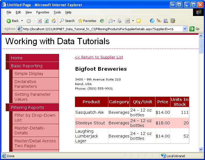 Figura 15: Los productos del proveedor seleccionado se muestran en ProductsForSupplierDetails.aspx (Haga clic para ver la imagen de tamaño completo)