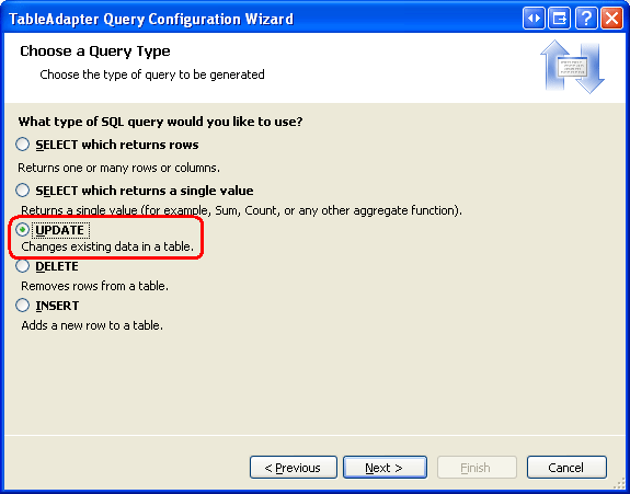 Abra el Conjunto de datos tipado y, en el Diseñador, haga clic con el botón derecho en el encabezado de CategoriesTableAdapter y elija Agregar consulta en el menú contextual para iniciar el Asistente para configuración de consultas TableAdapter. Este asistente comienza preguntándonos cómo debe acceder la consulta TableAdapter a la base de datos. Elija Usar instrucciones SQL y haga clic en Siguiente. En el paso siguiente se solicita el tipo de consulta que se va a generar. Puesto que estamos creando una consulta para agregar un nuevo registro a la Categories tabla, elija ACTUALIZAR y haga clic en Siguiente.