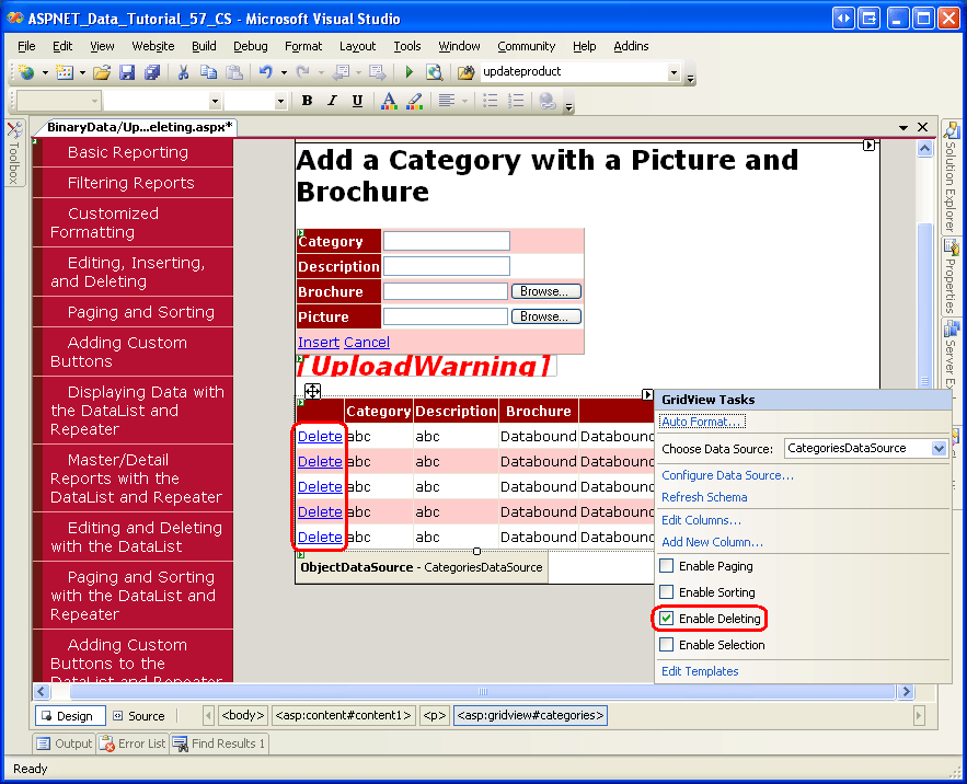 Como se ha explicado en el tutorial An Overview of Inserting, Updating, and Deleting Data (Introducción a la inserción, actualización y eliminación de datos ), GridView proporciona funcionalidades de eliminación integradas y estas funcionalidades se pueden habilitar en el tic de una casilla si el origen de datos subyacente de la cuadrícula admite la eliminación. Actualmente, el ObjectDataSource al que está enlazado el GridView (CategoriesDataSource) no admite la eliminación.