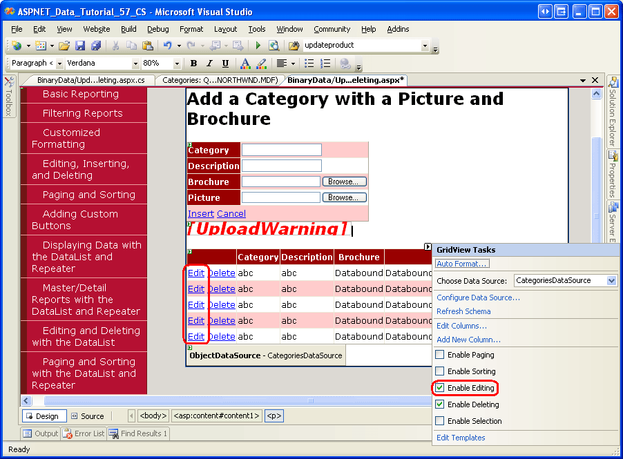 En el tutorial anterior hemos creado una página denominada UploadInDetailsView.aspx que enumera todas las categorías de una clase GridView y proporcionamos un DetailsView para agregar nuevas categorías al sistema. En este tutorial ampliaremos GridView para incluir soporte para edición y eliminación. En lugar de continuar trabajando desde UploadInDetailsView.aspx, coloquemos en su lugar los cambios de este tutorial en la página de la UpdatingAndDeleting.aspx misma carpeta, ~/BinaryData. Copie y pegue el marcado declarativo y el código de UploadInDetailsView.aspx a UpdatingAndDeleting.aspx.