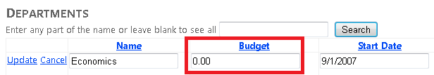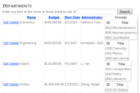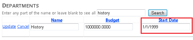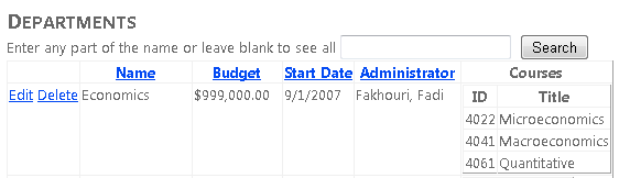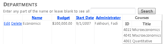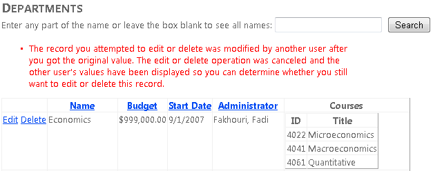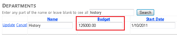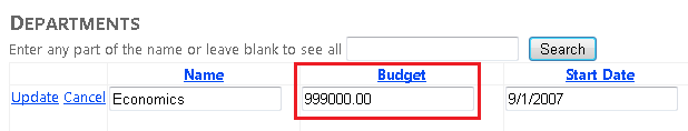 Haga clic en Editar en una fila y cambie el valor de la columna Presupuesto (recuerde que solo puede editar los registros que ha creado para este tutorial, ya que los registros de base de datos School existentes contienen algunos datos no válidos; el registro del departamento Economía es seguro para experimentar con él).