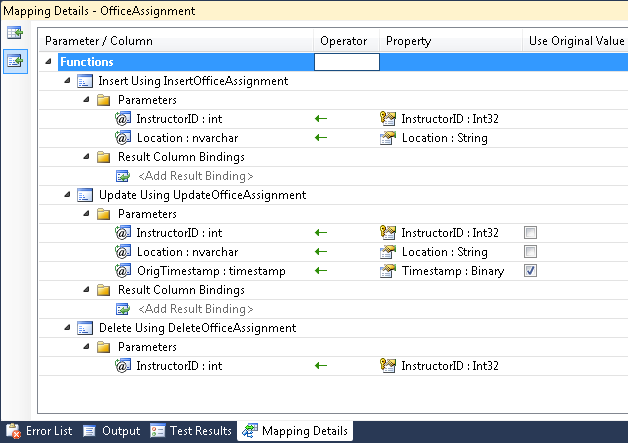 Si no guardara el valor Timestamp, Entity Framework no lo tendría para la cláusula Where del comando SQL Update. Por lo tanto, no se encontraría nada para actualizar. Como resultado, Entity Framework produciría una excepción de simultaneidad optimista cada vez que se actualizase una entidad OfficeAssignment.