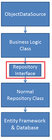 ObjectDataSourcea la clase de lógica empresarial en lugar de a la clase de repositorio. - Creación de un proyecto de prueba unitaria y una clase de repositorio que use colecciones en memoria para su almacén de datos.