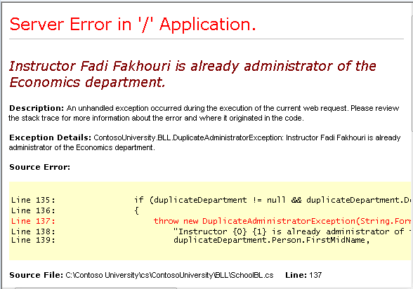 En el proyecto ContosoUniversity, ejecute la página Departments.aspx e intente cambiar el administrador de un departamento a alguien que ya sea administrador para otro departamento. (Recuerde que solo puede editar los departamentos que agregó durante este tutorial, ya que la base de datos se carga previamente con datos no válidos). Obtendrá la siguiente página de error del servidor: