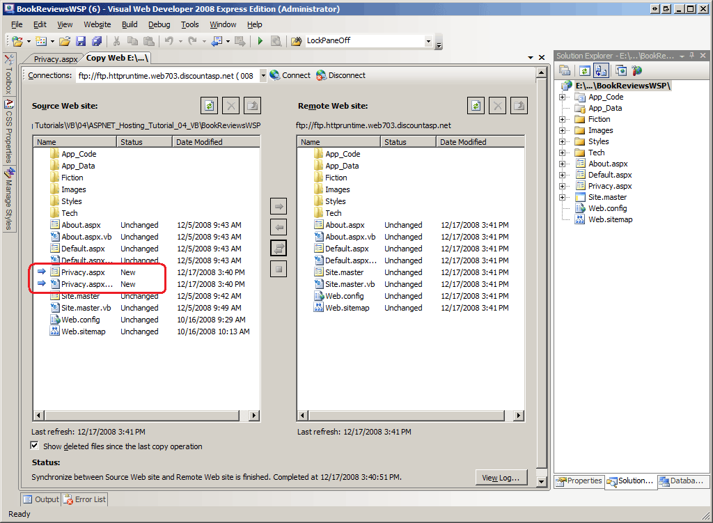 Ilustración 4: la herramienta Copiar sitio web incluye la página nueva Privacy.aspx en su panel izquierdo (Haga clic para ver la imagen a tamaño completo)