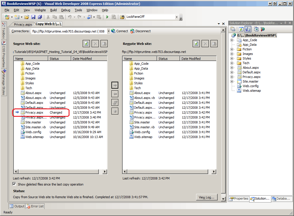 Junto con la lista de archivos nuevos, la herramienta Copiar sitio web resalta los archivos que difieren entre los sitios locales y remotos. Para ver esto en acción, vuelva a la página Privacy.aspx y agregue algunas palabras más a la directiva de privacidad. Guarde la página y vuelva a la herramienta Copiar sitio web. Como se muestra en la ilustración 5, la página Privacy.aspx del panel izquierdo tiene un estado Cambiado que indica que no está sincronizado con el sitio remoto.