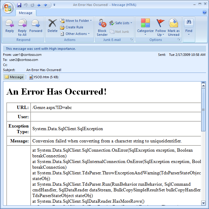 En la ilustración 2 se muestra el correo electrónico recibido al visitar Genre.aspx?ID=foo. El cuerpo del correo electrónico resume la información de la excepción, mientras que los datos adjuntos YSOD.htm muestran el contenido que aparece en la YSOD de detalles de la excepción (véase la ilustración 3).