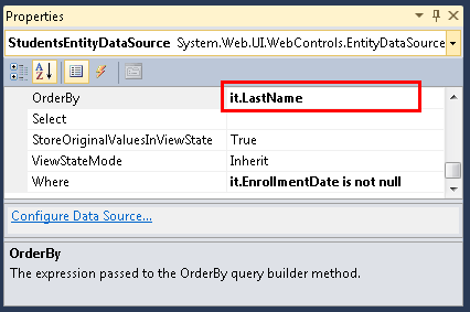 También desea que esta lista esté en orden de nombres cuando se muestre por primera vez. Con la página Students.aspx todavía abierta en vista Diseño y con el control EntityDataSource aún seleccionado, en la ventana Propiedades, establezca la propiedad OrderBy en it.LastName.