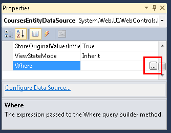 En la ventana Propiedades, haga clic en los puntos suspensivos del cuadro de propiedades Where. (Asegúrese de que el control CoursesEntityDataSource sigue seleccionado antes de utilizar la ventana Propiedades).