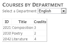 Ejecute la página y use la lista desplegable para seleccionar diferentes departamentos. Solo se muestran los cursos ofrecidos por el departamento seleccionado en el control GridView.