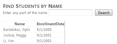 Este marcado es similar al que ha visto anteriormente, excepto el valor de la propiedad Where. La segunda parte de la expresión Where define una búsqueda de subcadenas (LIKE %FirstMidName% or LIKE %LastName%) que busca tanto en el nombre como en el apellido lo que se introduzca en el cuadro de texto.