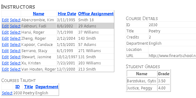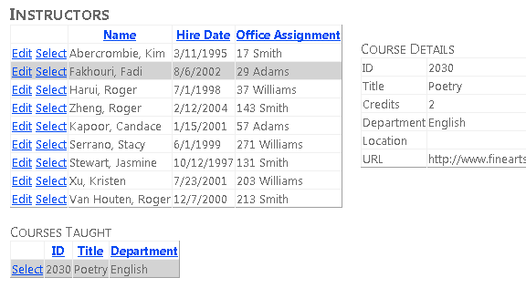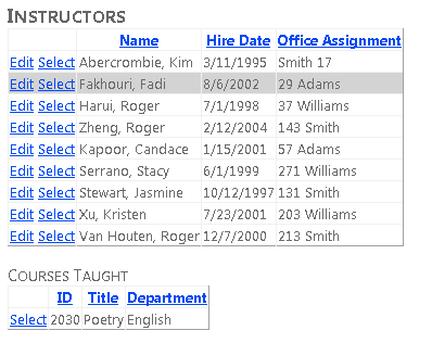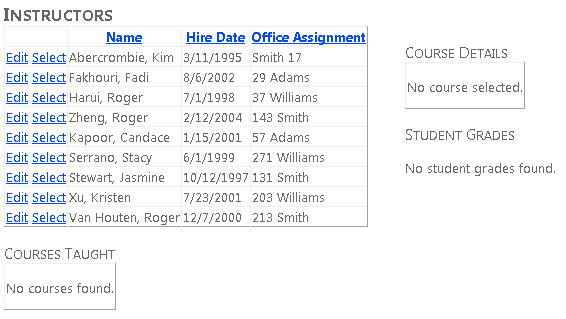 Creará la página Instructors que muestra una lista de instructores. Al seleccionar un instructor, verá una lista de los cursos que enseña ese instructor. Al seleccionar un curso, verá los detalles del curso y una lista de alumnos inscritos en el curso. Puede editar el nombre del instructor, la fecha de contratación y la asignación de oficina. La asignación de office es un conjunto de entidades independiente al que se accede a través de una propiedad de navegación.