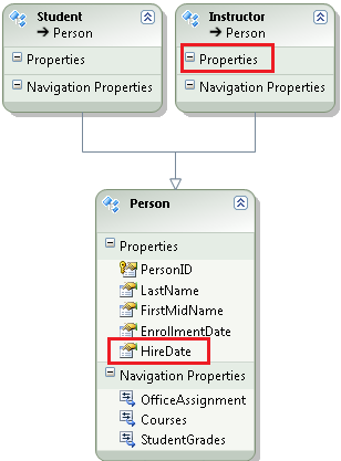 Solo los instructores tienen fechas de contratación, por lo que debe mover esa propiedad de la Person entidad a la Instructor entidad. En la entidad, haga clic con el Person botón derecho en la HireDate propiedad y haga clic en Cortar. A continuación, haga clic con el botón derecho en Propiedades en laInstructor entidad y haga clic en Pegar .
