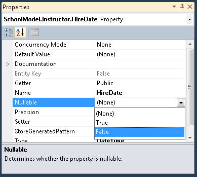 La fecha de contratación de una Instructor entidad no puede ser null. Haga clic con el botón derecho en la propiedad HireDate, haga clic en Propiedades y, a continuación, en la ventana Propiedades cambie Nullable a False.
