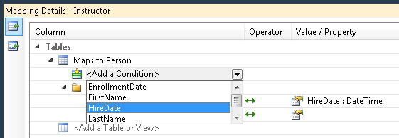 Repita el procedimiento para la Students entidad y especifique que esta entidad se asigna a la Person tabla cuando la EnrollmentDate columna no es null. A continuación, guarde y cierre el modelo de datos.