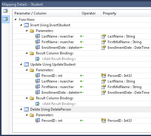 En la misma ventana Detalles de asignación, asigne la función Update al procedimiento almacenado UpdateStudent (asegúrese de especificar FirstMidName como valor de parámetro para FirstName, como hizo para el procedimiento almacenado Insert) y la función Delete al procedimiento almacenado DeletePerson.