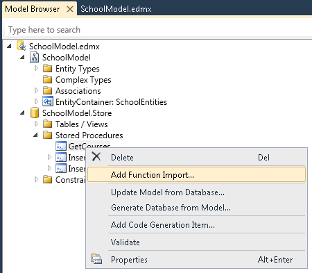 En el caso de los procedimientos almacenados que leen en lugar de actualizar datos, use la ventana Explorador de modelos para asignar el procedimiento almacenado al tipo de entidad que devuelve. En el diseñador del modelo de datos, haga clic con el botón derecho y seleccione Explorador de modelos. Abra el nodo SchoolModel.Store y, a continuación, abra el nodo Procedimientos almacenados. A continuación, haga clic con el botón derecho en el procedimiento almacenado GetCourses y seleccione Agregar importación de funciones.
