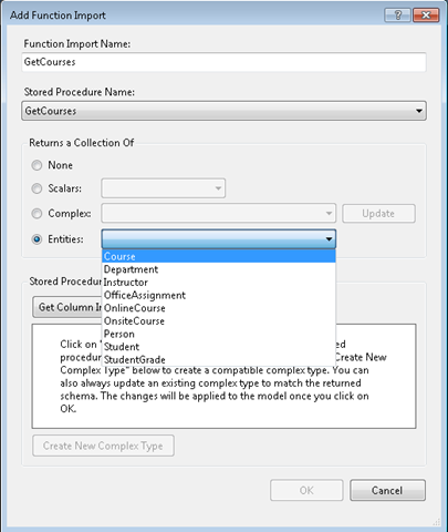 En el cuadro de diálogo Agregar importación de funciones, en Devuelve una colección de seleccione Entidades y, a continuación, seleccione Course como el tipo de entidad devuelto. Cuando haya terminado, haga clic en Aceptar. Guarde y cierre el archivo .edmx.