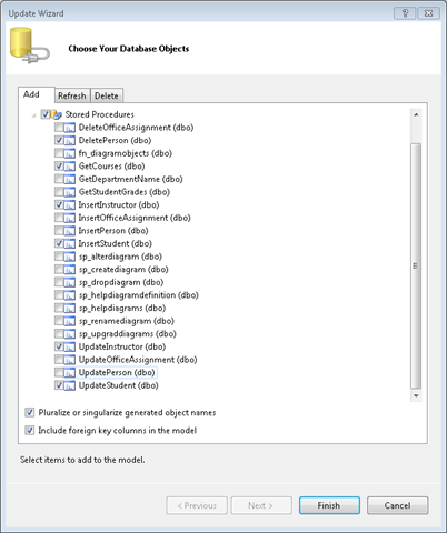 Los procedimientos almacenados ahora se definen en la base de datos, pero deben agregarse al modelo de datos para que estén disponibles para Entity Framework. Abra SchoolModel.edmx, haga clic con el botón derecho en la superficie de diseño y seleccione Actualizar modelo desde la base de datos. En la pestaña Agregar del cuadro de diálogo Elegir los objetos de base de datos, expanda Procedimientos almacenados, seleccione los procedimientos almacenados que acaba de crear y el procedimiento almacenado DeletePerson y, a continuación, haga clic en Finalizar.