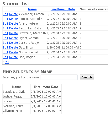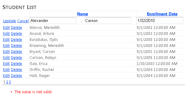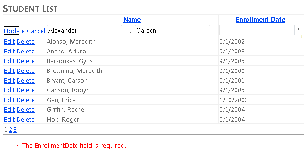 EnrollmentDatese mostrará como una fecha (sin una hora).- Ambos campos de nombre deben tener 25 caracteres o menos de longitud y se proporciona un mensaje de error personalizado.