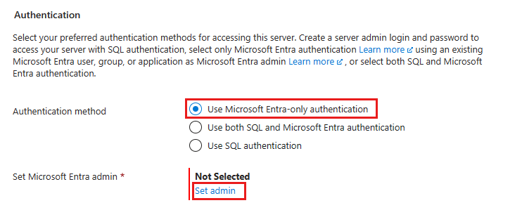 - Método de autenticación: seleccione Usar la autenticación solo de Microsoft Entra.