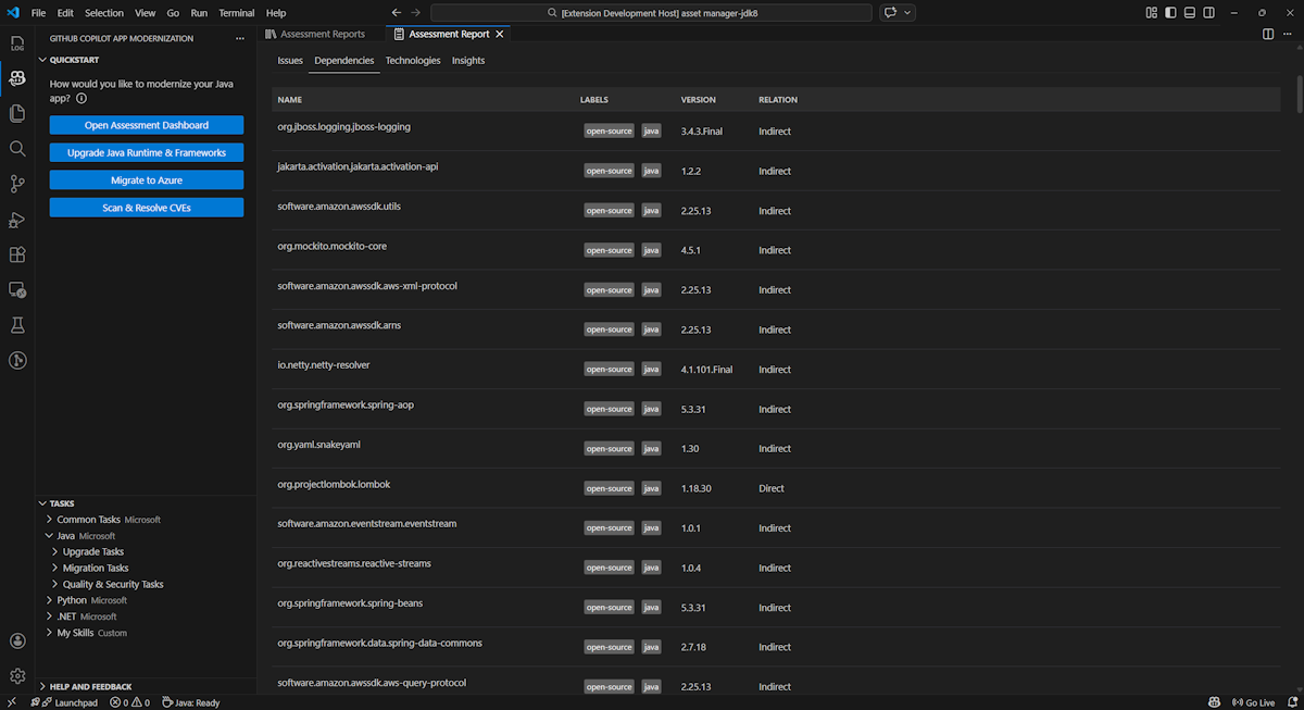 - Seleccione Start Assessment (Iniciar evaluación ) o Open Assessment Dashboard (Abrir panel de evaluación) en la sección QUICKSTART del panel de modernización de GitHub Copilot.