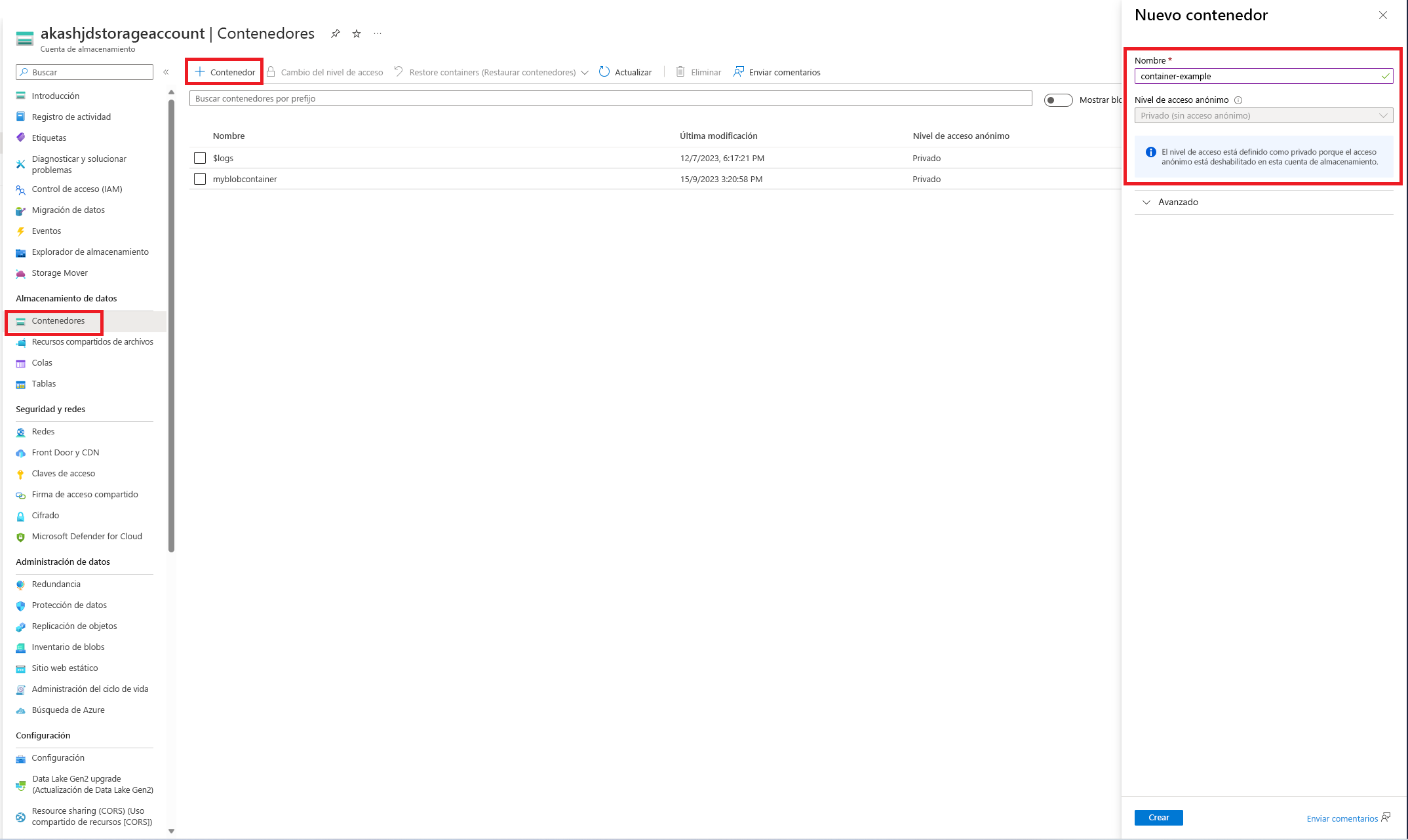 Para crear un contenedor en Azure Portal, siga estos pasos: